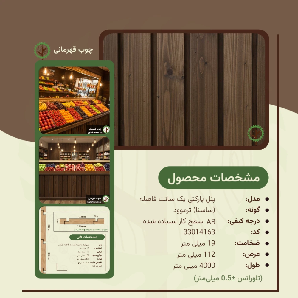 پنل پارکتی نیمبهنیم یکسانت فاصله ترموود با ساختار مهندسیشده و ظاهر دکوراتیو مدرن، گزینهای مناسب برای پروژههایی است که نیازمند تلفیق زیبایی چوب طبیعی، مقاومت بالا و طراحی متمایز هستند. ساخت این محصول با چوب ترموود گونه ساسنا و ترموود شدن در کورهی دانشبنیان مجموعه موجب افزایش پایداری ابعادی، مقاومت رطوبتی و دوام طولانیمدت در محیطهای داخلی و نیمهباز میشود.