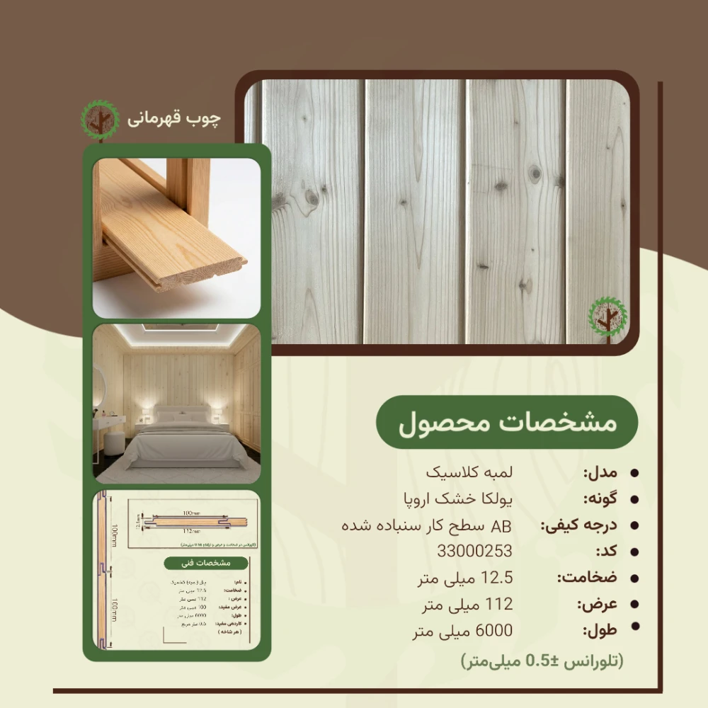 ابعاد استاندارد 12.5 × 112 × 6000 میلیمتر از محبوبترین و استانداردترین سایزبندیها برای استفاده بهعنوان دیوارپوش و سقفپوش محسوب میشود و تعادل ایدهآلی میان زیبایی بصری، سرعت اجرا و هدررفت حداقلی ایجاد میکند. این ابعاد همچنین امکان اجرای یکنواخت، سریع و دقیق را فراهم کرده و گزینهای بسیار کاربردی برای فضاهای داخلی و نیمهباز مسقف محسوب میشود. قابلیت پرداخت نهایی، سنبادهکاری، رنگکاری و روغنکاری تخصصی نیز امکان هماهنگی کامل با سبکهای مختلف طراحی را ایجاد میکند.